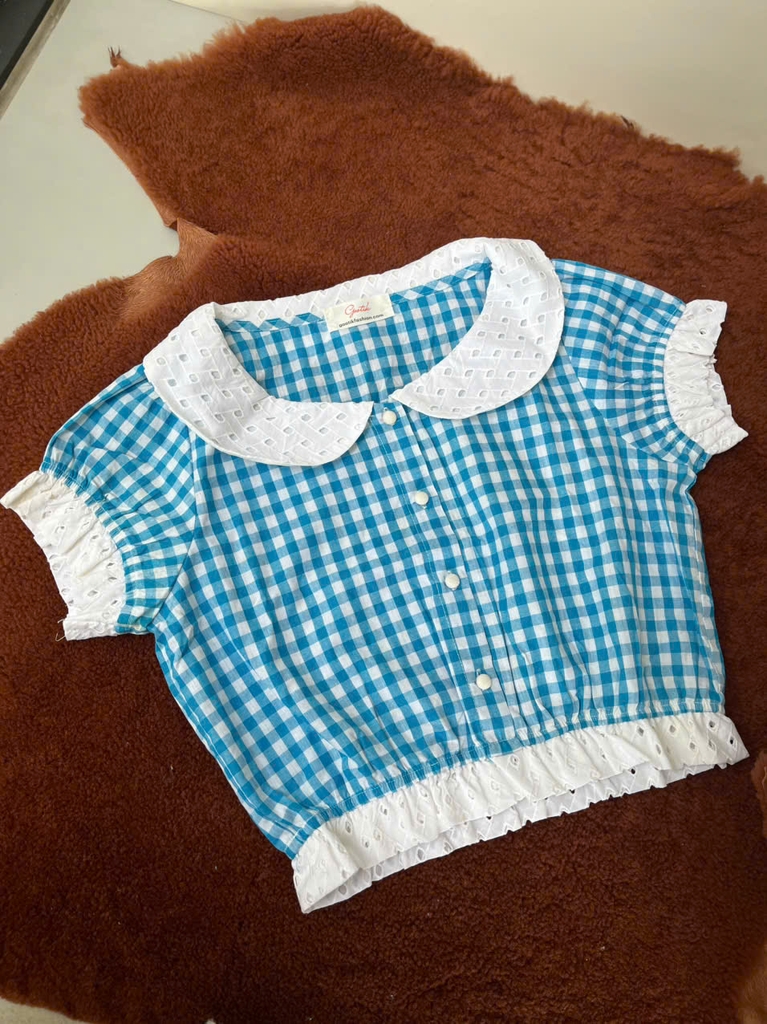🔹 Chất liệu: Vải cotton kẻ caro xanh trắng, mềm mại, thoáng mát – thích hợp mặc mùa hè.