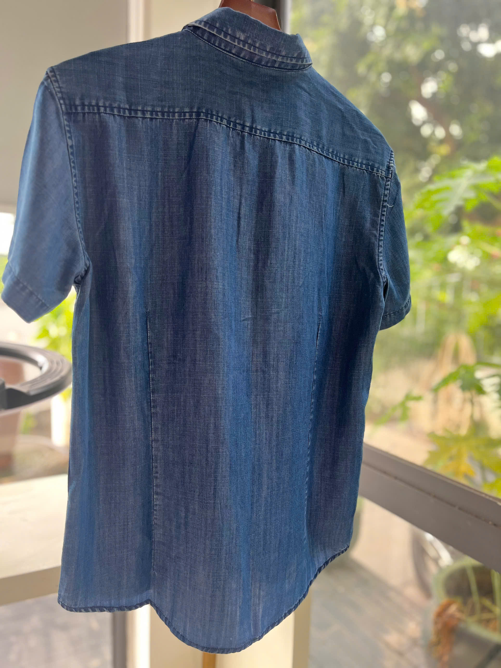 Chất liệu: Vải denim mềm, màu xanh chàm đậm (indigo blue), có độ phai nhẹ tạo cảm giác cổ điển và bụi bặm.