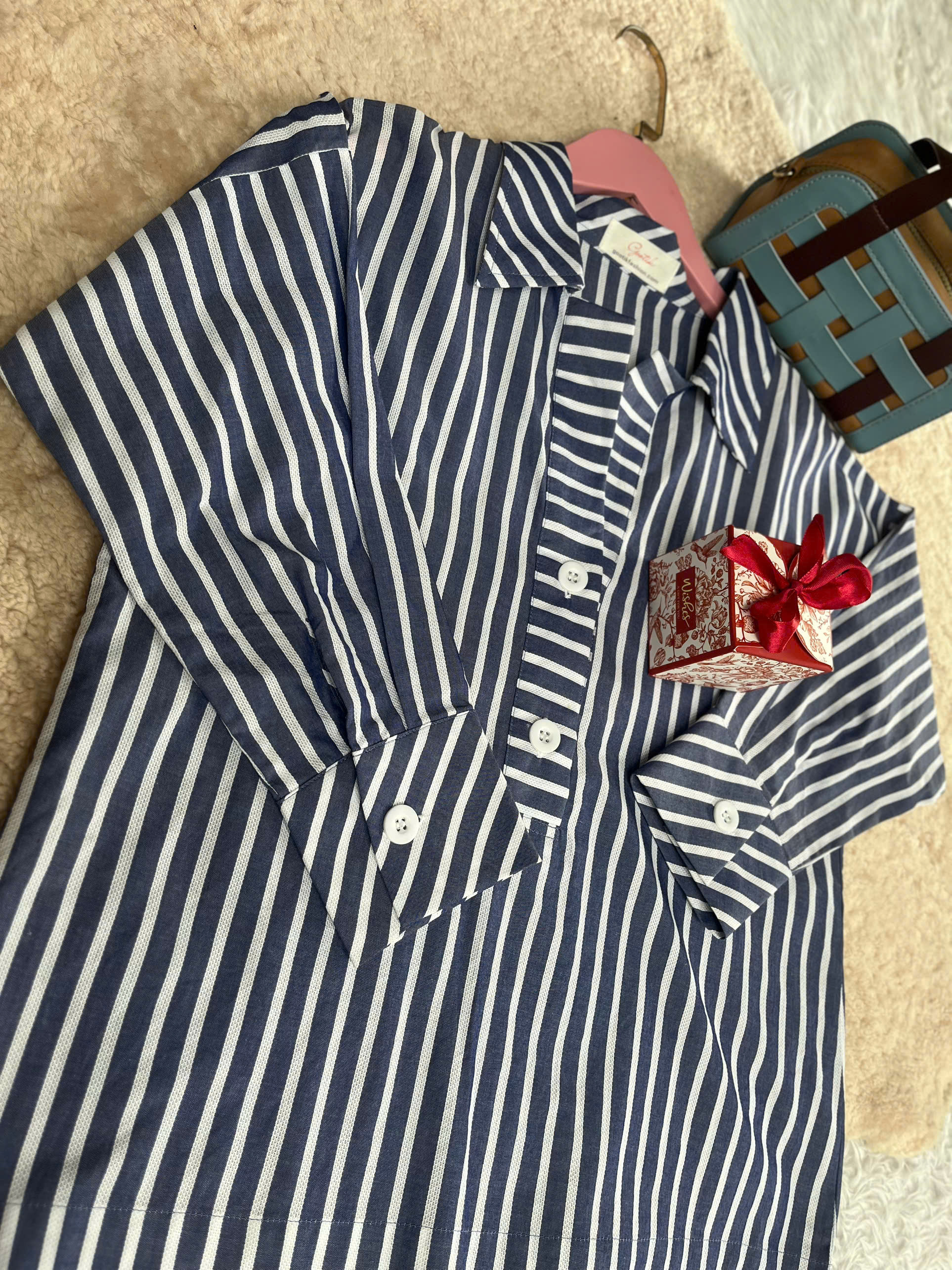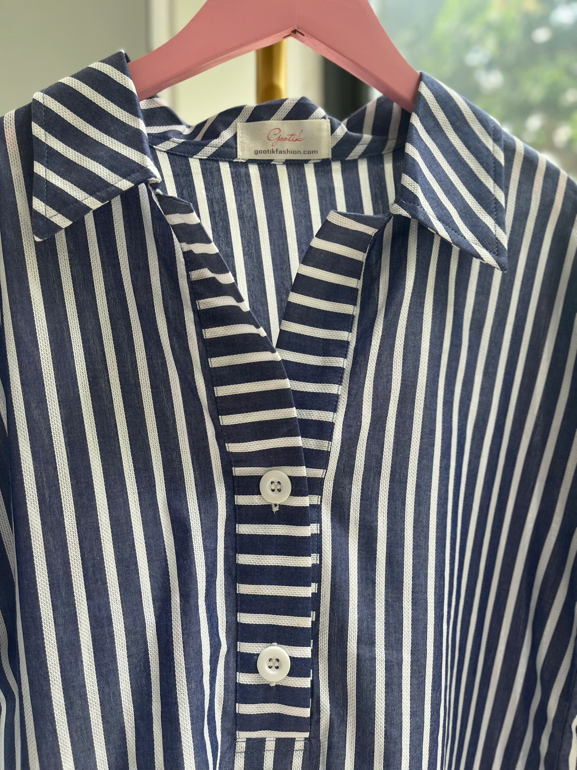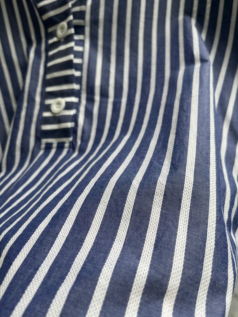 Hàng nút trắng nổi bật, phối trên nền sọc ngang ở nẹp áo để tạo điểm nhấn. T