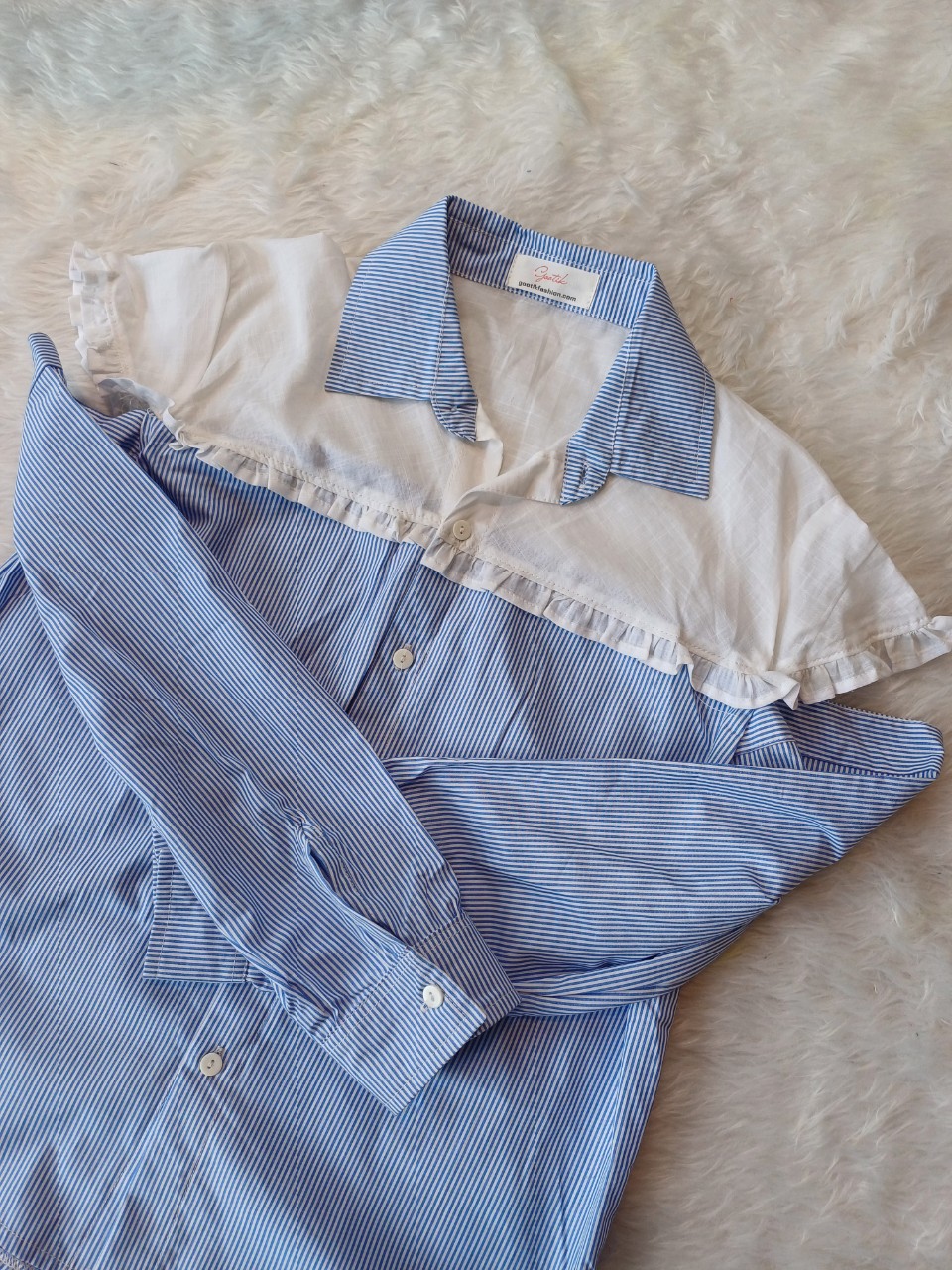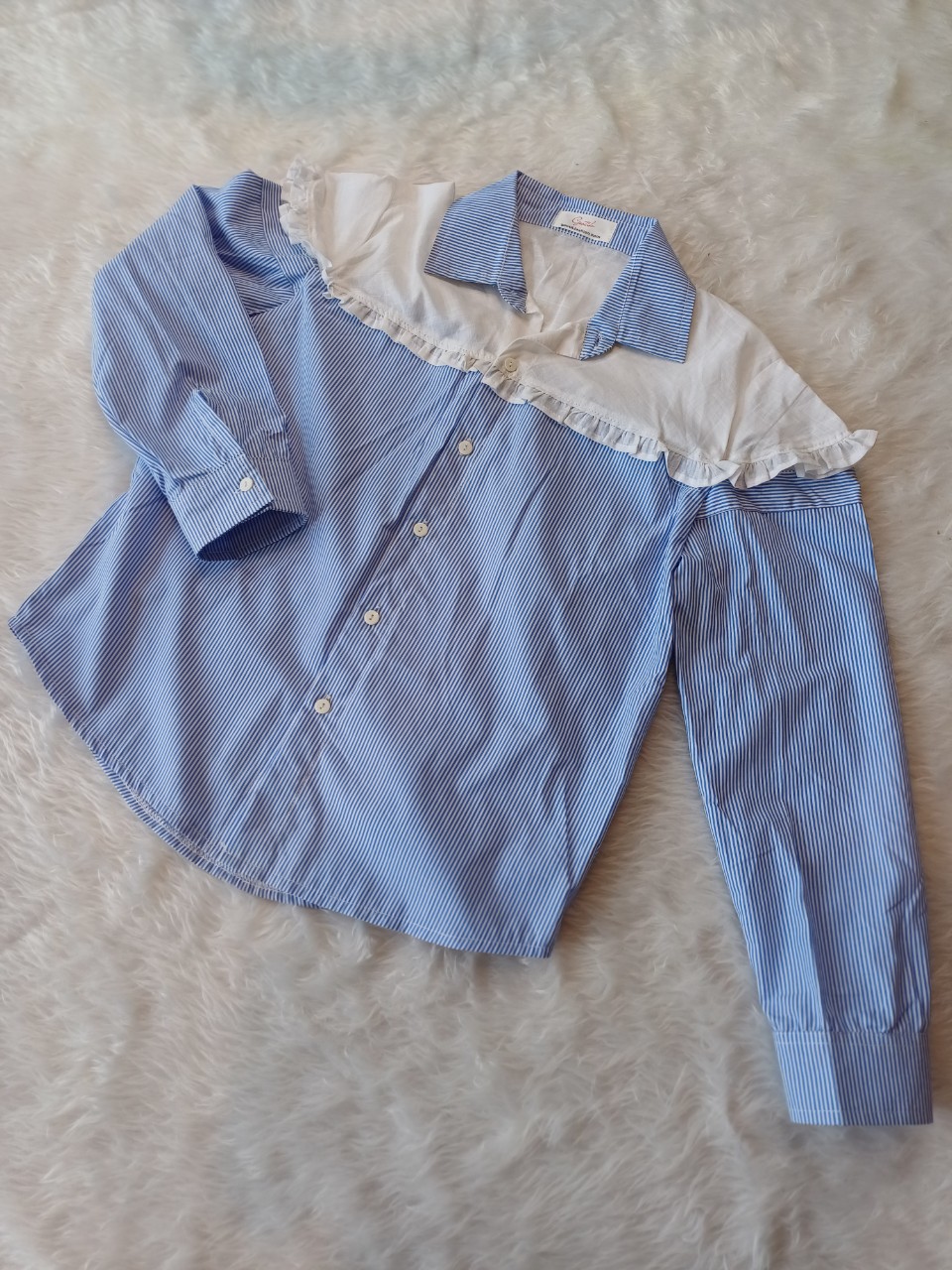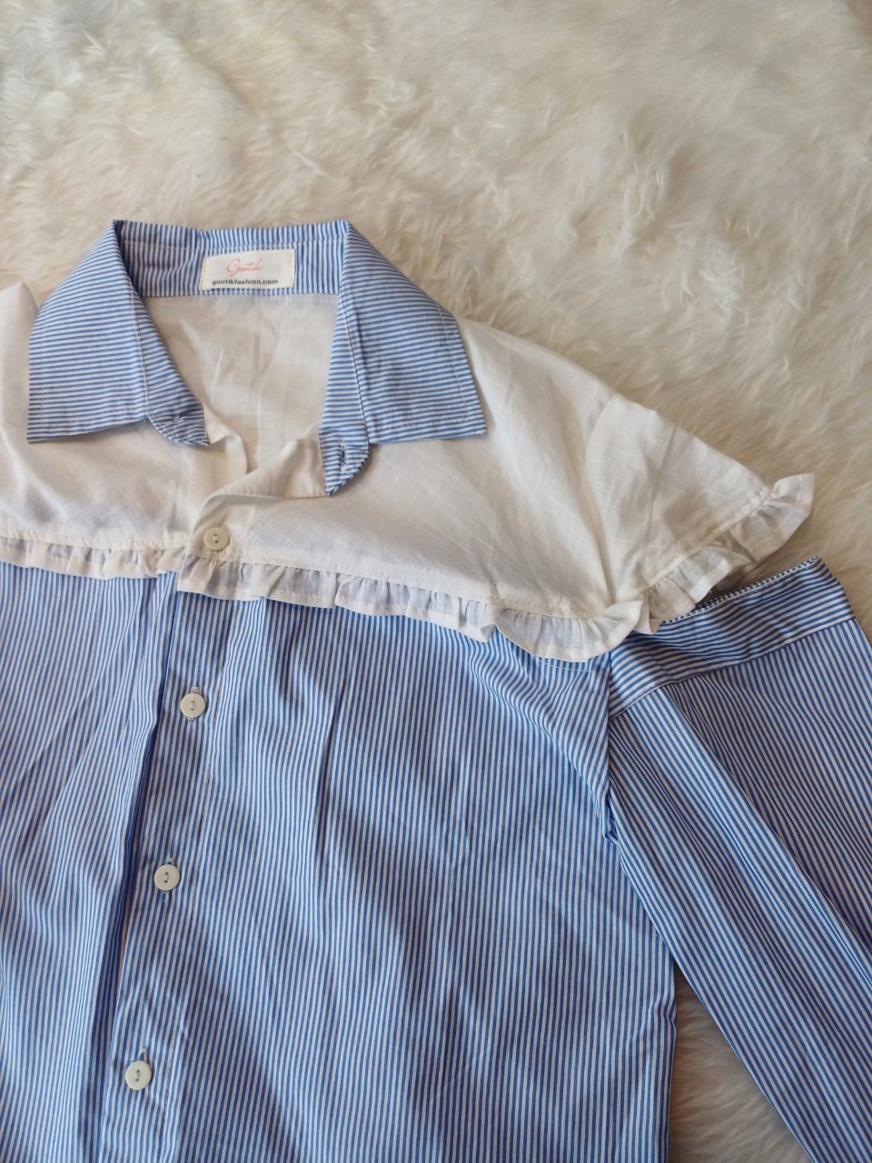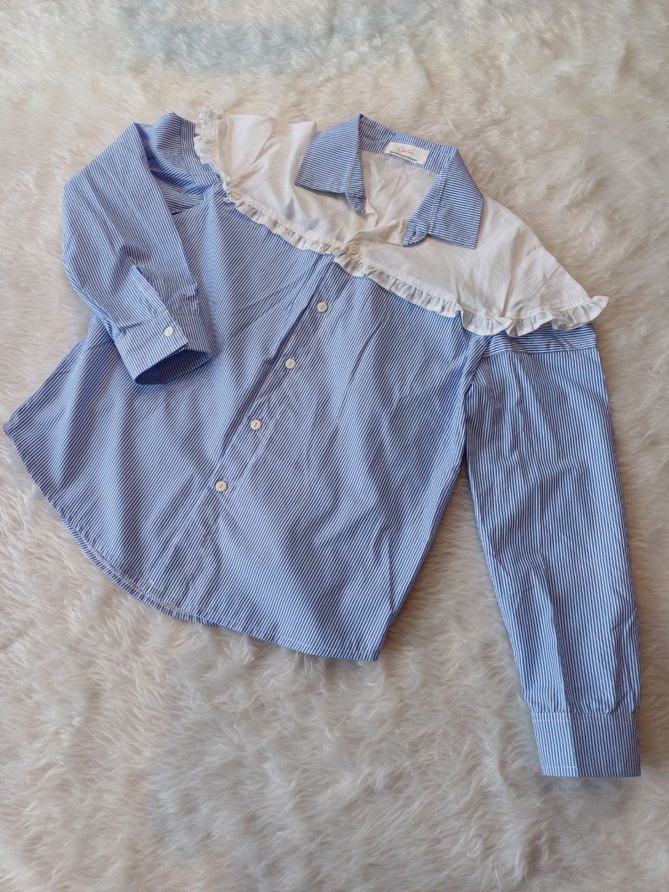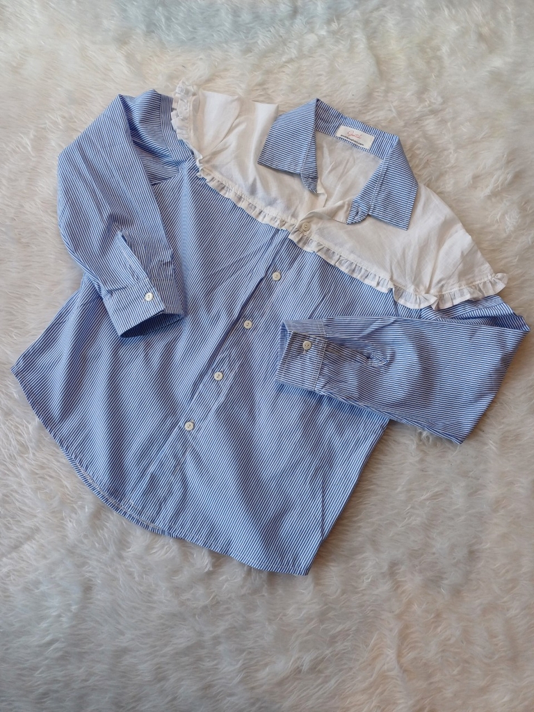 Chiếc áo sơ mi tay nối với sọc xanh phối mảng trắng phần cổ sẽ tạo cho cô nàng một style mới lạ đó ah.