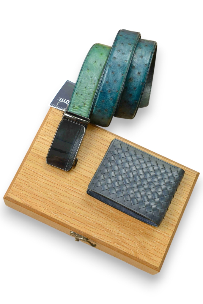 Dây nịt luôn là một phụ kiện không thể thiếu đối với các đấng mày râu. Mẫu dây nịt mặt da đà điểu màu xanh dương độc đáo tạo nên sự hài hòa mà không kém phần sang trọng, quý phái.